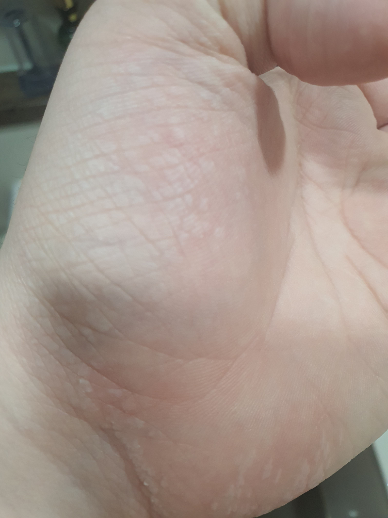 두드러기 반응이 보이는 것이라 생각됩니다. 가라앉지 않는다면 알레르기약을 복용해보실 수 있겠고 그래도 나아지지 않으면 피부과를 방문해보시기 바랍니다.
