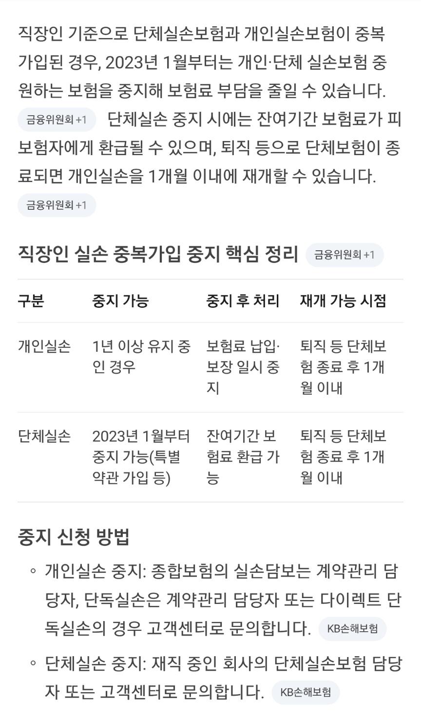 개인적으로 가입한 실손보험은 일단 보험사에 연락하여 단체실손보험이 있다는 것을 확인하고 중지시켰다가 추후 회사 퇴사시 해당 보험을 재개하면 됩니다.