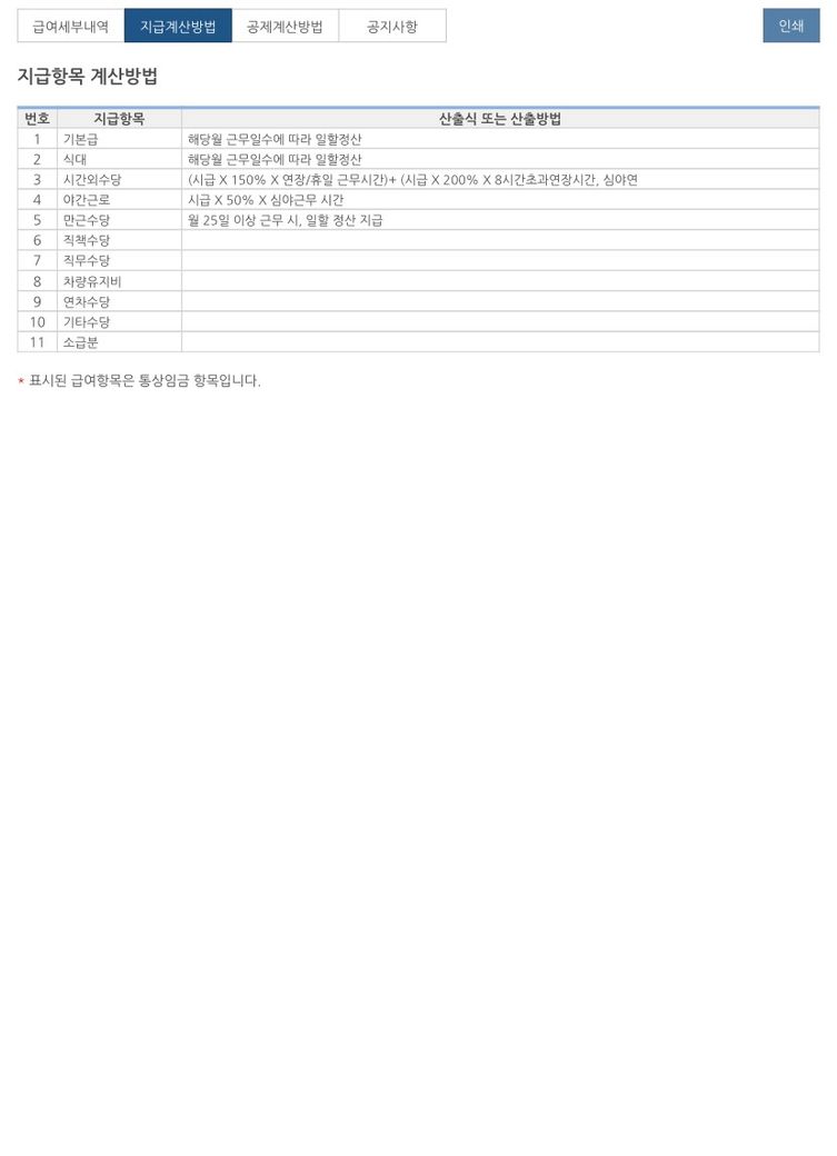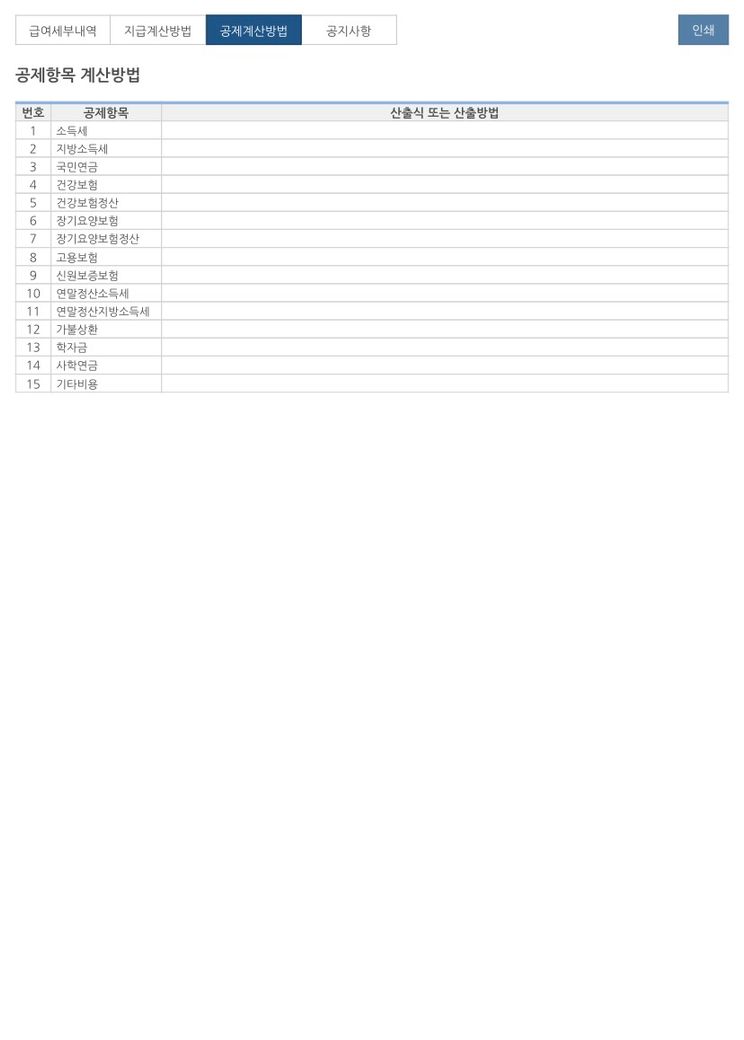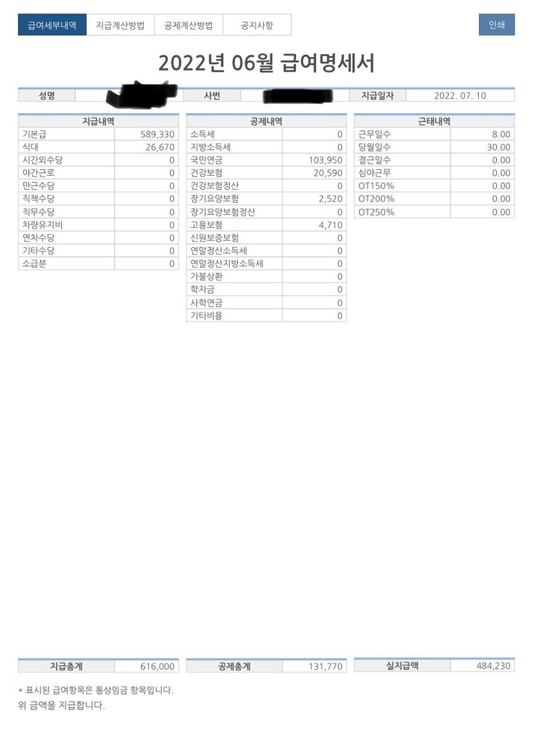 급여명세서 공제항목은 공란으로 왔습니다.
