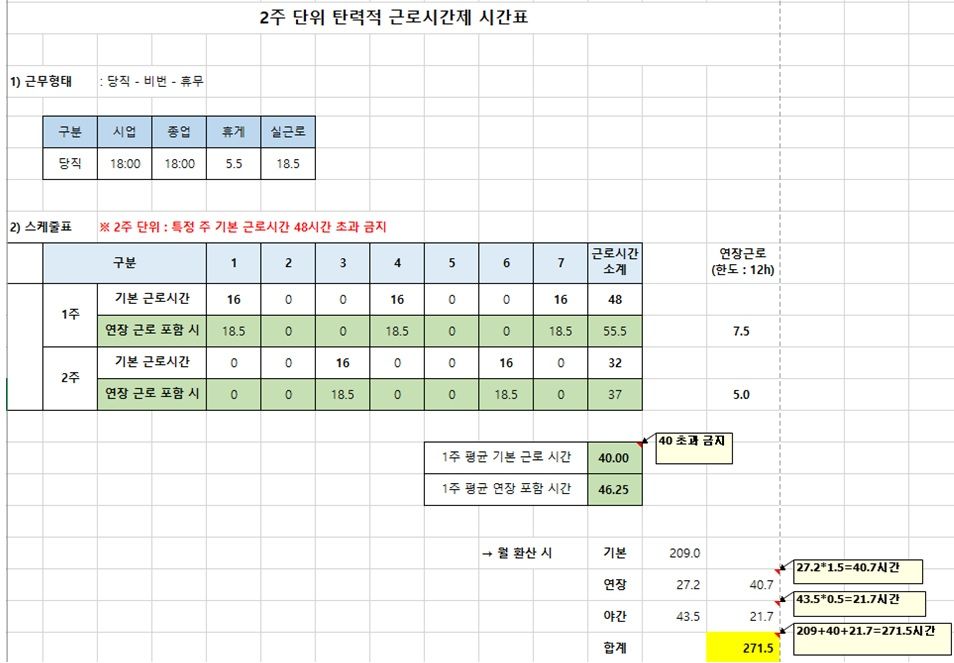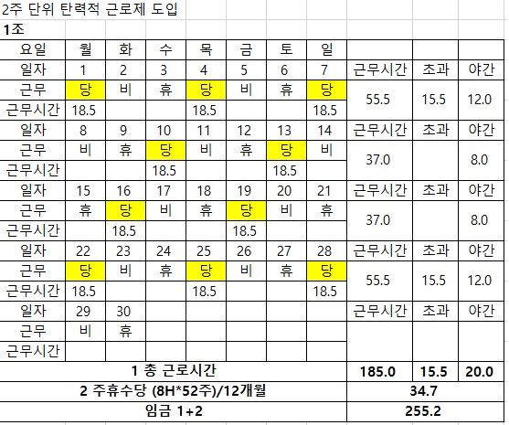 당비비 2주단위탄력근로제 도입 시 근무시간 어떤게 맞나요???