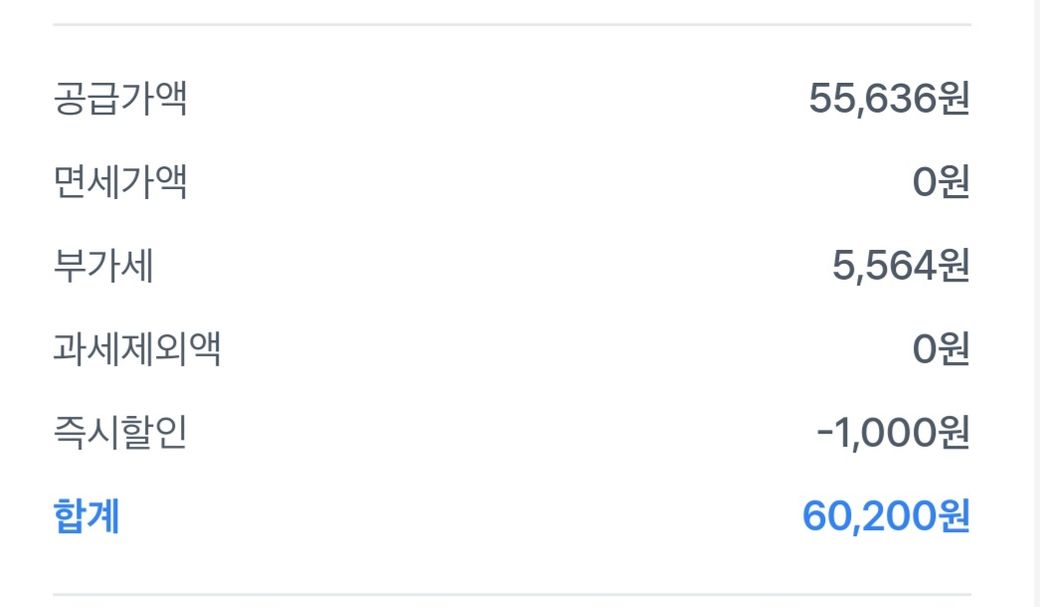 매입 부가가치세를 신고하고 있는데 아래처럼 할인 받은 매입건의 금액을 어떻게 신고해야 할지 모르겠습니다. 할인 전 금액인 공금가액 55,636원, 부가세 5,564원으로 신고해야 할지 아니면 1000원 할인 받은 60,200 원에 1.1 나눠서 부가세를 등록해야하나요?