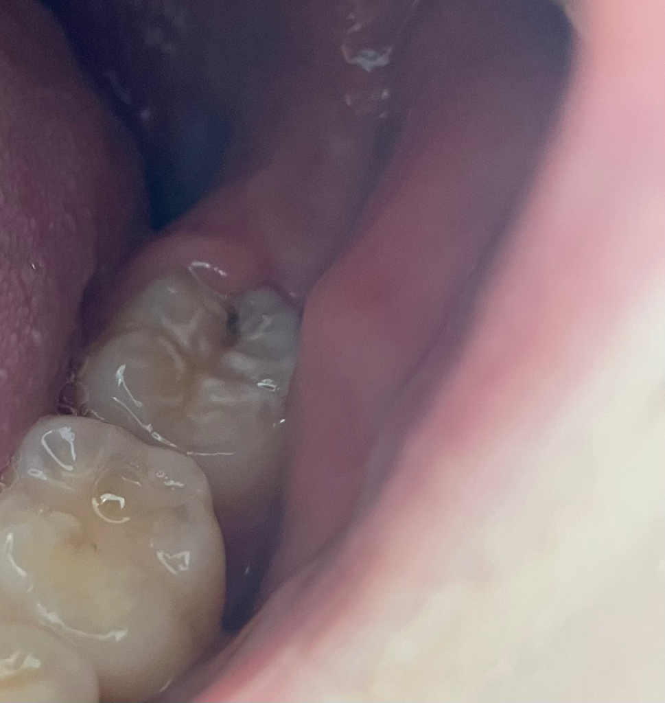 현재 사진상으로 볼때 충치가 있는 것으로 보입니다. 방치시에 충치가 더 진행될 가능성이 있기에 빠른시일내에 치과치료를 받는 것이 좋습니다.