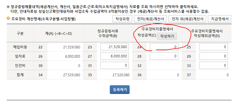 아래 칸에 적으실 수 있는 비용은 매입비용,임차료,원천세신고한 인건비만