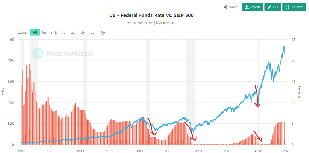 그래서 금리 인하가 주식시장에 미치는 영향은 상황에 따라 달라지며, 항상 주식시장 하락을 초래하는 것은 아닙니다.