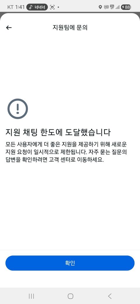 짧은 시간안에 여러번 채팅을 시도하면, 시스템이 자동으로 한도도달 메시지를 띄어서 더이상 연결되지 않게 합니다. 계장당 하루 혹은 일정 기간 내 문의 횟수 제한이 있을겁니다. 아마 같은 문제를 여러 상담원에게 동시에 보내는것을 막기 위한 장치일것이고 보통 몇시간이나 하루 정도 지나면 다시 채팅이 가능해질수도 잇어요.