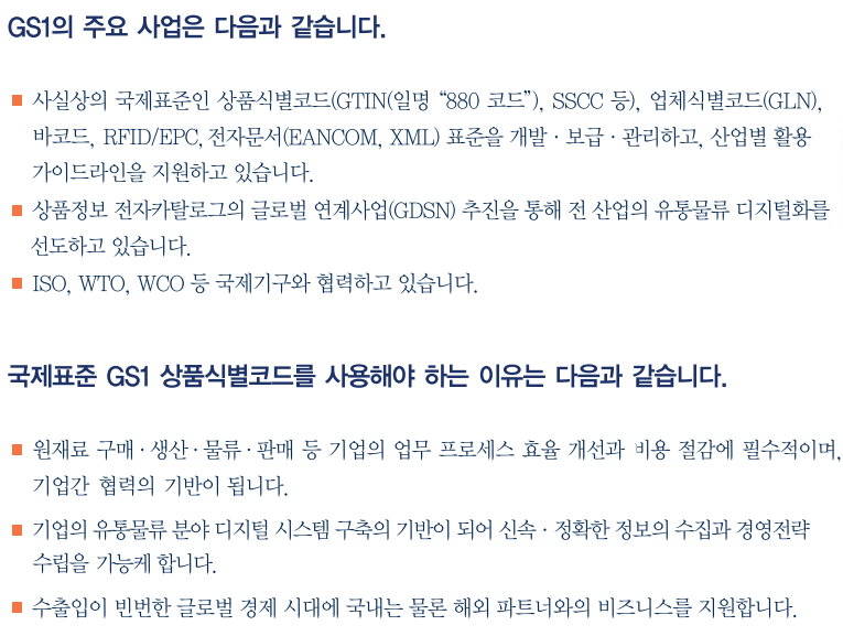 우리나라는 대한상공회의소에서 GS1의 회원으로 가입하여 관련업무를 수행하고 있다고 합니다.