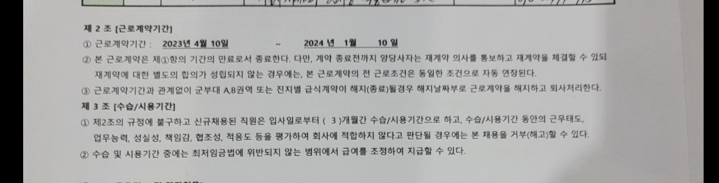 근로자가 계속 근로한 기간이 3개월 미만인 경우, 천재ㆍ사변, 그 밖의 부득이한 사유로 사업을 계속하는 것이 불가능한 경우등을 제외하고는 해고예고수당의 대상이 됩니다. 사용자는 근로자를 해고하려면 적어도 30일 전에 예고를 하여야 하고, 30일 전에 예고를 하지 아니하였을 때에는 30일분 이상의 통상임금을 지급하여야 하지만 근로계약서 제2조3항에 따르는 것이 부득이한 사유로 사업을 계속하는 것이 불가능한 경우에 해당한다면 대상이 되지 않을 수 있습니다. 노동청에 진정제기 하여 관련내용을 다퉈보는 것도 가능합니다.