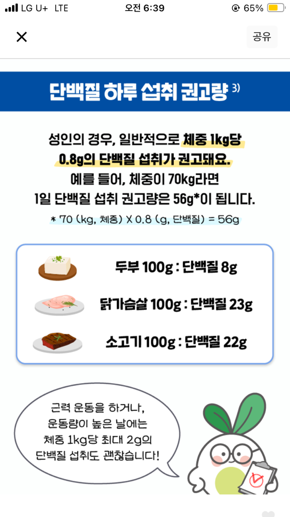4. 현재 몸무게가 70~72정도 이신데.. 손목닥터에서 보니까 권장 단뱍질 섭취량이 몸무게x0.8 이더라고요.