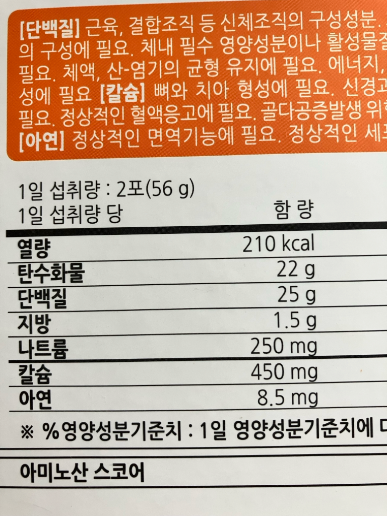 1. 할머니께서 단백질 타서 드시는 걸 하루에 2포 드시고 계십니다. 보니까 2포면 56g이라고 써져있는데
