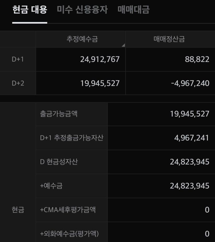 매매정산금으로 입금되는 +88,822원과, 출금되는 -4,967,240원이 있어 최총 2영업일 뒤 인출가능 금액, 최종 출금가능금액은 19,945,527원입니다.