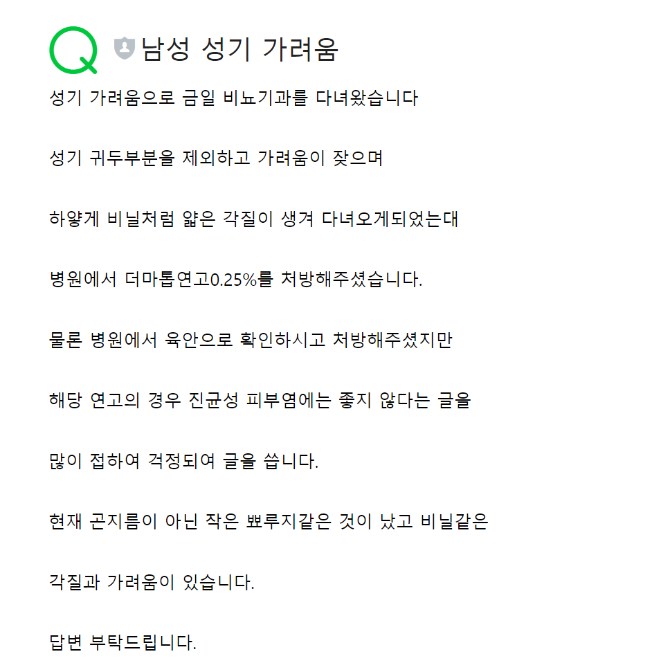 아래 사진의 글과 증상이 똑같습니다 성기가 귀두를 제외하고 매번 가렵고 심하게 긁으면 피부가 민감해지면서 만지면 아프고 각질이 생깁니다 병원가기 좀 창피해서 집에 있는 크림을 써보려고 하는데 더마톱연고와 같은 성분인 (프레드니카르베이트) 보드미크림을 발라볼려고 하는데 괜찮을까요? 한달정도 하루 2회 발라보고 효과가 없으면 병원가도 되겠죠?