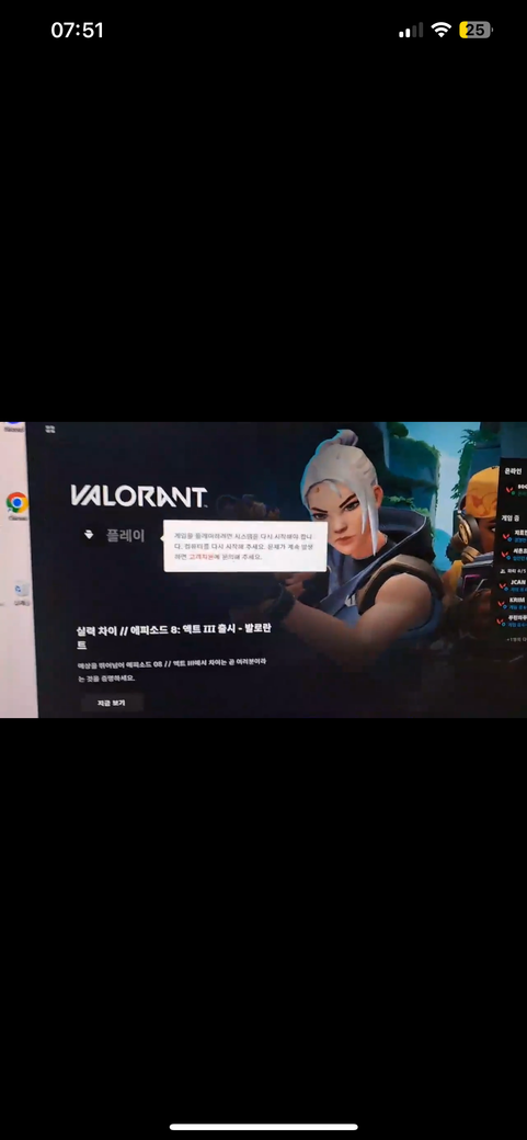 2. **시스템 재부팅**: 가끔은 시스템 자체의 문제로 발생할 수도 있습니다. 컴퓨터를 완전히 재부팅한 후 발로란트를 다시 실행하여 문제가 해결되는지 확인해 보세요.