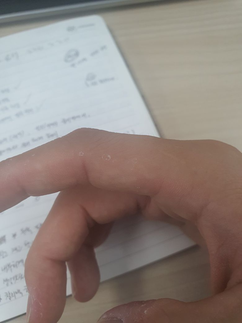 이게 어떤증상인지 알고싶습니다. 몇달전부터 간헐적으로 생깁니다. 한번생기면 꽤오래가구요. 무좀인지 습진인지 한포진인지 어떤피부질환인지 궁금합니다.