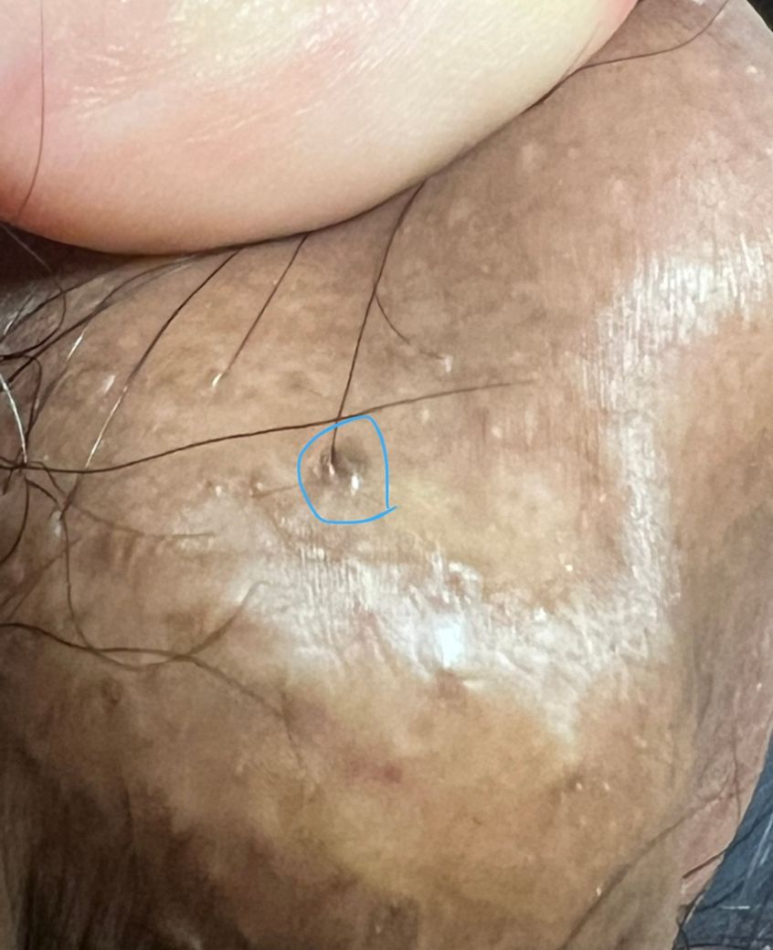 • 성병성 병변(매독의 단일 궤양, 헤르페스 수포 등)과는 형태가 다릅니다. 검은 점 형태로 나타나지 않습니다.