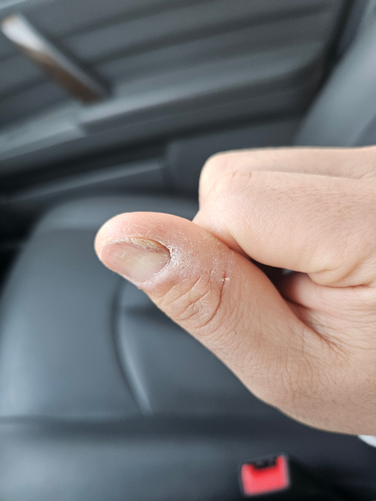 노랗게 변하고 두꺼워진 부분이 보이며 발톱무좀이 있다면 손톱무좀의 위험도 존재하므로 피부과에서 확인해보셔야 하겠습니다. 그리고 경구 무좀약을 복용하는 동안에는 반드시 금주해야합니다.