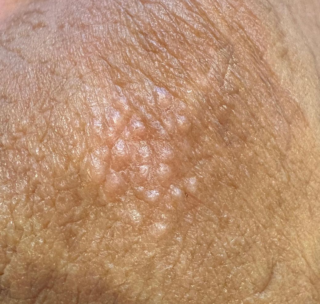 올려주신 병변은 균일한 크기의 작은 돌기들이 모여 있고 염증, 물집, 궤양, 통증이 없어 정상 변이(피지샘, 포다이스 반점, 마찰·건조로 인한 피부결 변화) 또는 단순 각질성 변화 가능성이 더 높아 보입니다. 특히 색 변화가 크지 않고 만져도 아프지 않다면 성병 가능성은 상대적으로 낮습니다.