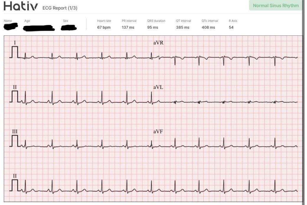 그리하여 온전한 답변을 드리기는 어렵지만, 사진 속 심전도는 특별히 문제될 소견은 보이지 않습니다.