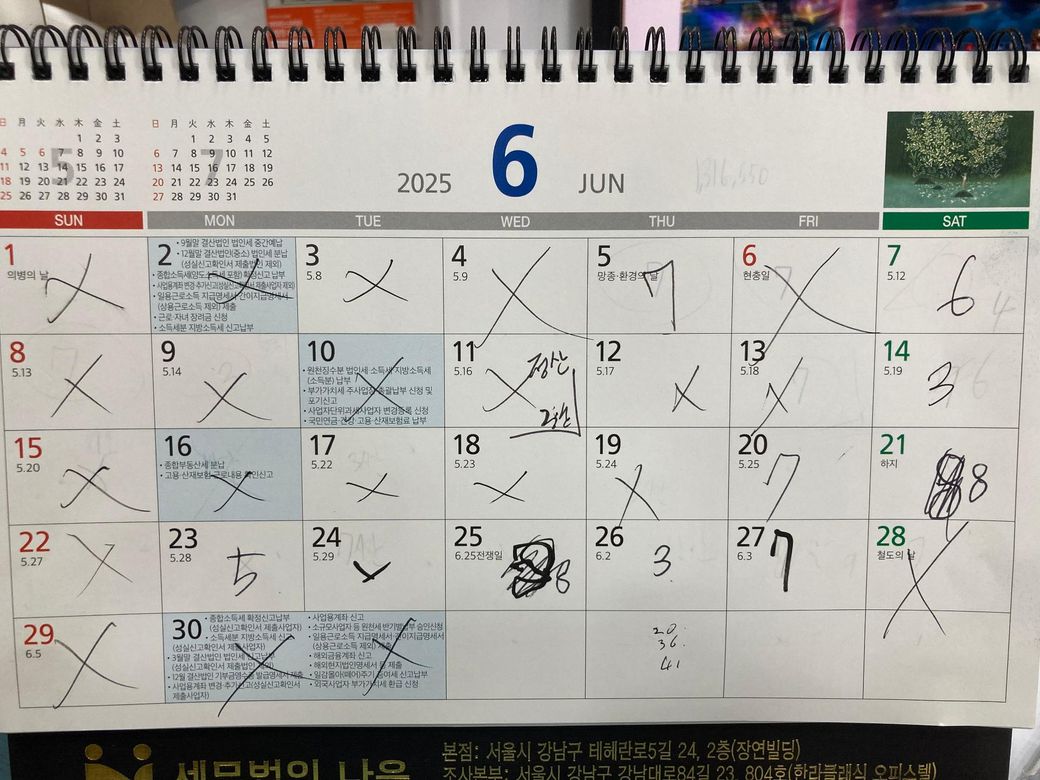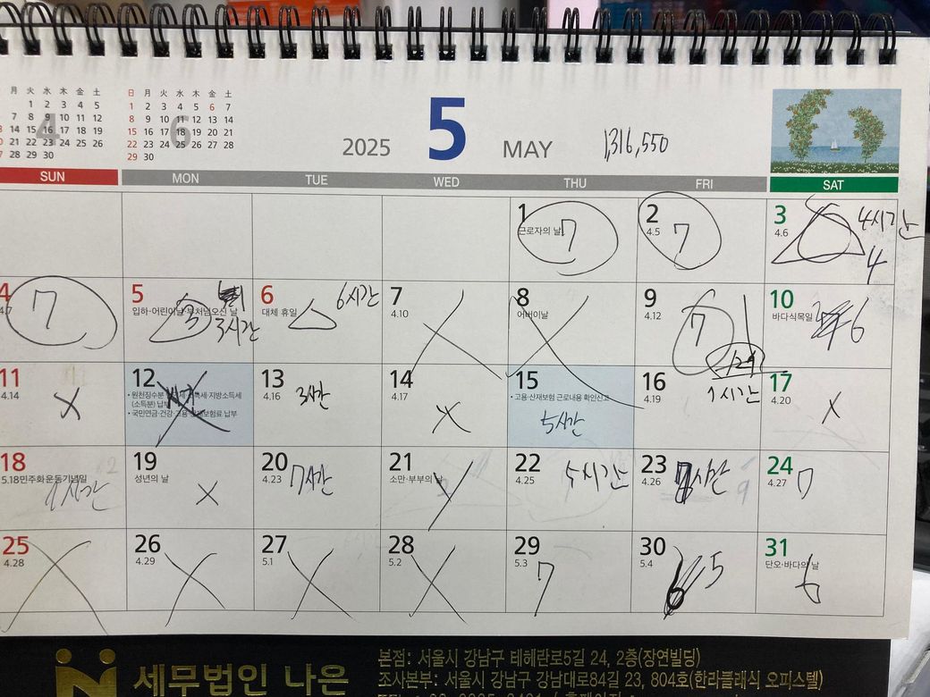 그런데 달력의 x표시가 의미가 불분명해서 명확한 답은 어려우나 만약 소정근로일이 사용자 말대로 전혀 정해진바없이 실질적으로 일용직처럼 그때그때 불러서 일을하는 것이라면 주휴수당 대상은 되기 어렵기는 합니다.