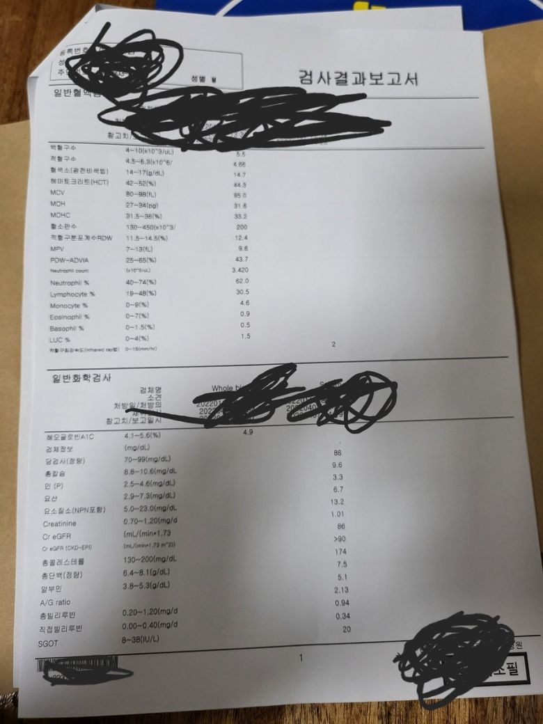 모든 검사들이 정상 범위에 속하고 있으며 소변 검사에서 뇨단백이나 유로빌리노겐