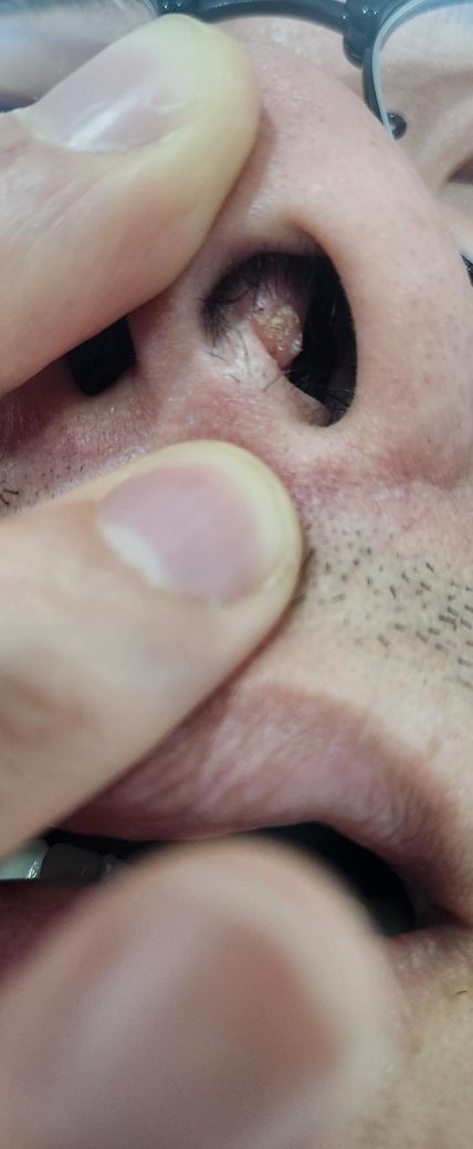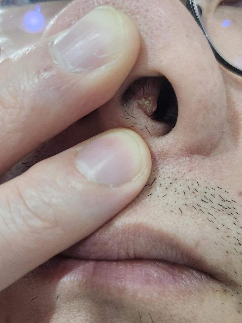 셋째, 비강 용종 가능성은 낮습니다. 용종은 대개 더 깊은 비강에 생기고 말랑하며 회백색이고, 코 끝이나 입구에 단독으로 2년 이상 그대로 있는 경우는 드뭅니다.