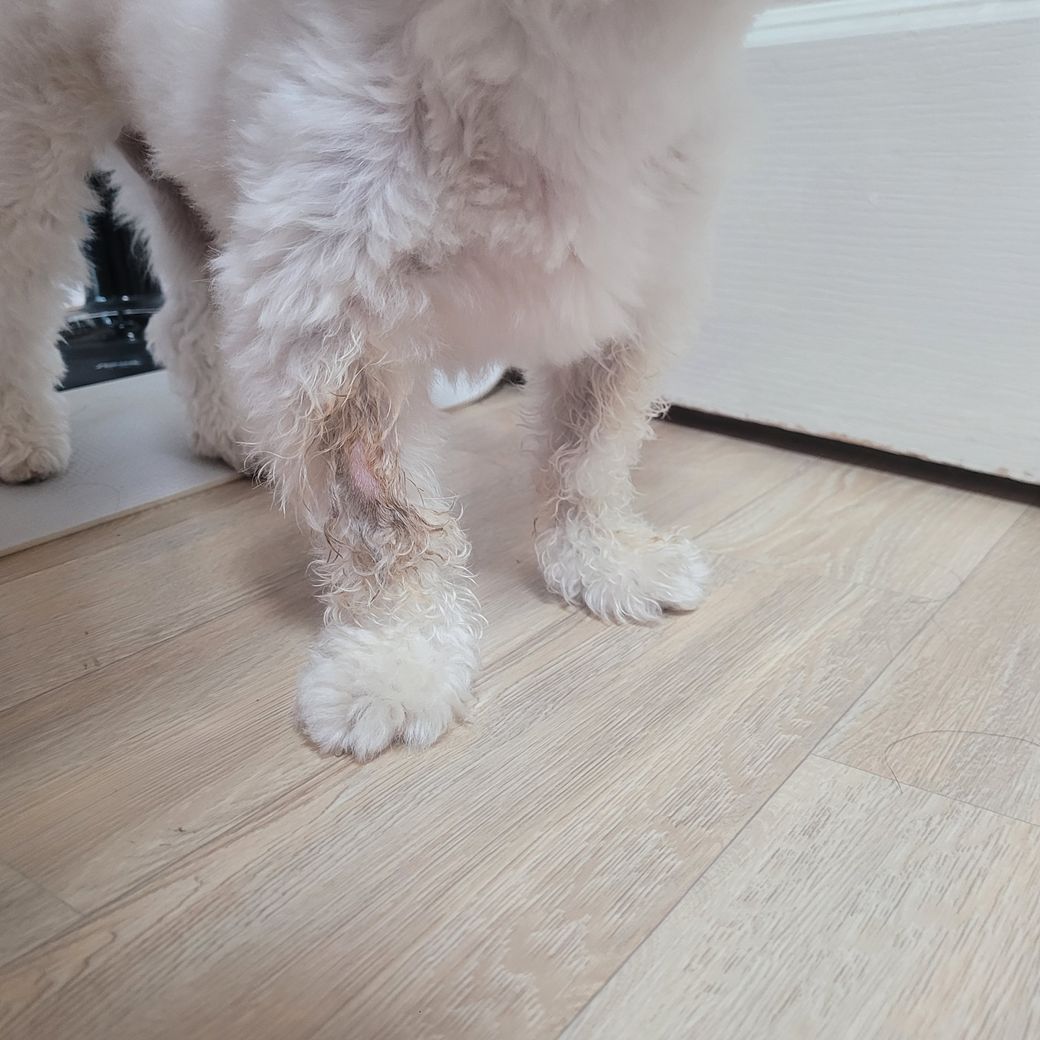 처음 꾹꾹거려서 털 뽑혔을때 병원갔는데 소양증 약 먹어도 줄어듬이 없고 피부에도 문제 없고 나이가 어려서 관절염일 가능성은 낮고 걷는것도 문제 없어보이고 만져도 괜찮아해서 스트레스일 가능성이 높다했어요 처음엔 주로 산책할때 모래밭을 간다던지 가고싶은대로 못가게하던지 줄을 댕기거나 그러니까 꾹꾹거리더라고요 아침에 산책 나갈때도 내려놓자마자 꾹꾹거리고 그래서 아침산책 나가는것도 안나가고 산책방법도 바꿨어요 산책방법을 바꾸고 스트레스 완화에 도움이 되는 간식도 사고 그랬어요 그랬더니 자주안해서 줄어들었나 싶었는데 오늘 자고일어나니까 잔뜩 뜯어놨더라고요ㅠㅠㅠ산책방법 바꾸고 줄어들긴했거든요? 근데 평소에 뭔가 좀 뭐 못하게하면 심하지않디만 좀 꾹꾹거림 없지않아 있었는데 일어나니까 잔뜩 꾹꾹거려놨더라고요 심지어 반대 다리도 그랬는지 양쩍 다 뭐가 묻은것마냥 저래되어있더라고요 시진은 물수건으로 닦아준 후에 찍은거고요 원래는 1번 사진에서 고쳐가고있었거든요 밑에 두개는 오늘 아침이요..스트레스때매 그러는게 맞을가요? 일단 오늘 병원을 가긴할건데 어때보이시나요?ㅠㅠㅠ스트레스가 맞으면 저걸 어떻게 고쳐줘야할지 모르겠어요..