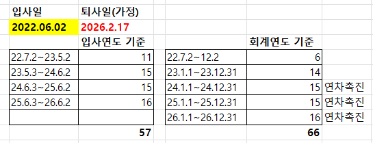 연차를 회계연도 기준으로 계산하고 있으며, 퇴사 시 입사연도 기준으로 재계산하고 있습니다.