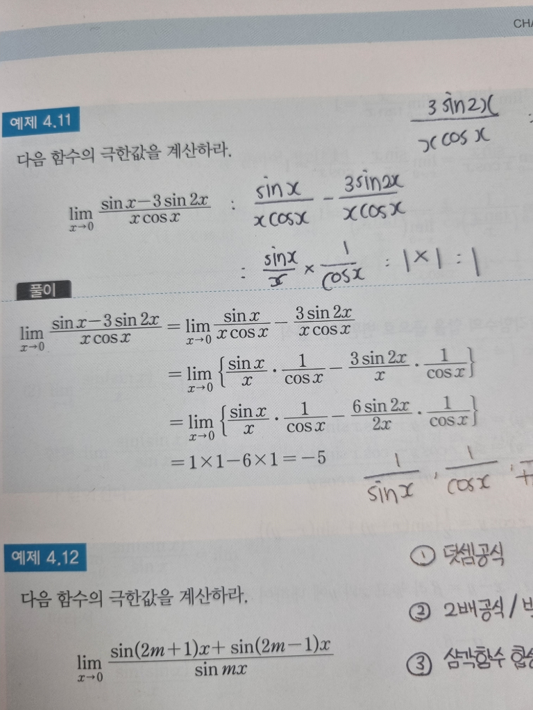 예제 4.11 문제에서 cos분에 1이 왜 1의 값을 가지는지가 잘 모르겠습니다 만약 삼각함수 관련 공식이라면 sin/1과 tan/1함수도 알려주셔와요