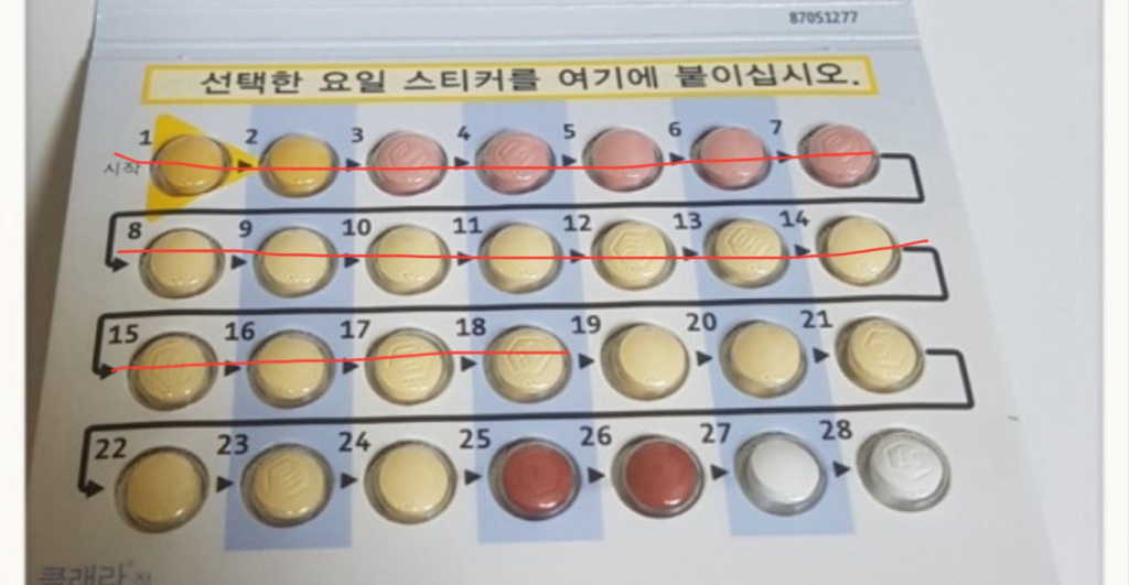 새팩을 뜯어서 노란색을 먹다가 여행을 다녀오고나서는 갈색-흰색 이렇게 드셔서 생리를 하면 돼요.