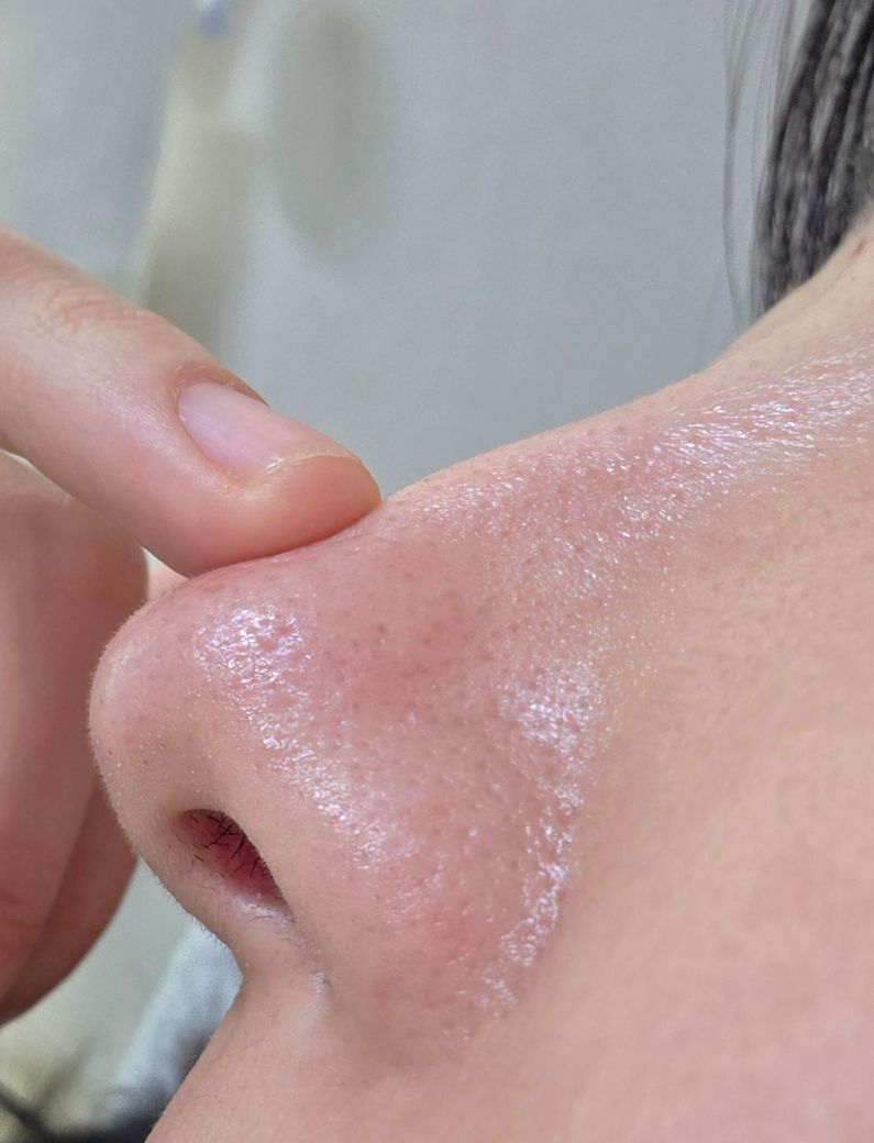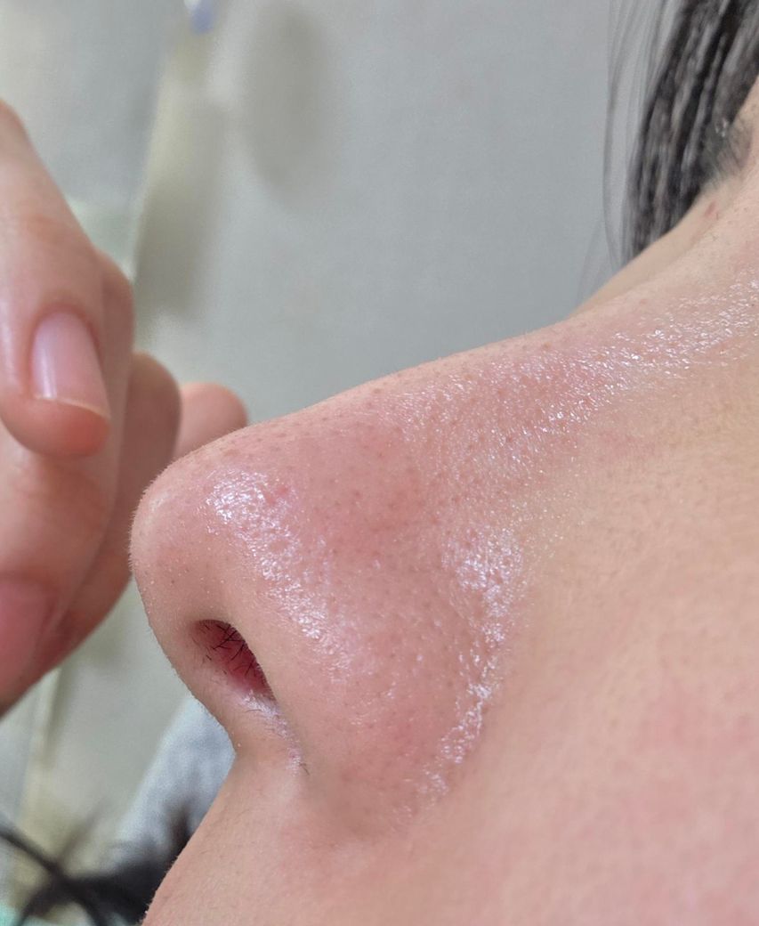 가장 흔한 건 보형물 변형이나 위치 이동입니다. 실리콘 같은 보형물이 시간이 지나면서 접히거나 살짝 이동하면 콧등 일부가 눌려서 딱 저렇게 함몰된 것처럼 보일 수 있습니다. 그리고 보형물 주변에 섬유성 막이 생기면서 조직이 당겨지는 피막 구축이라는 것도 가능성이 있고, 자가 연골을 썼다면 연골이 흡수되거나 휘어지는 경우도 있습니다.