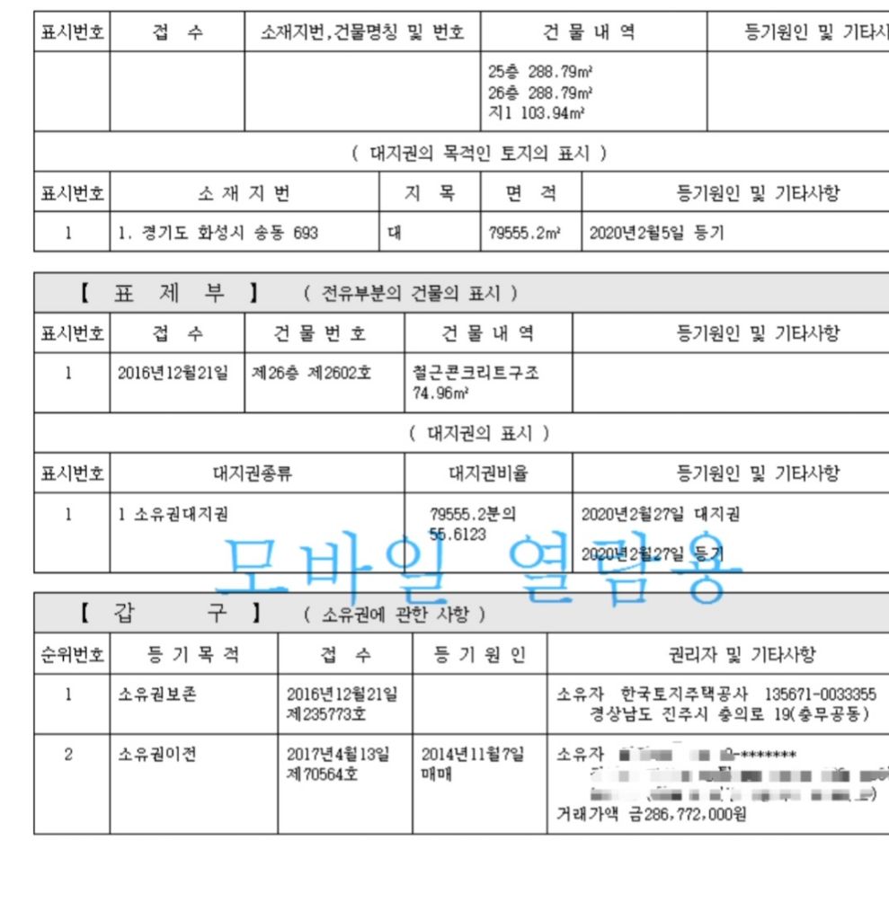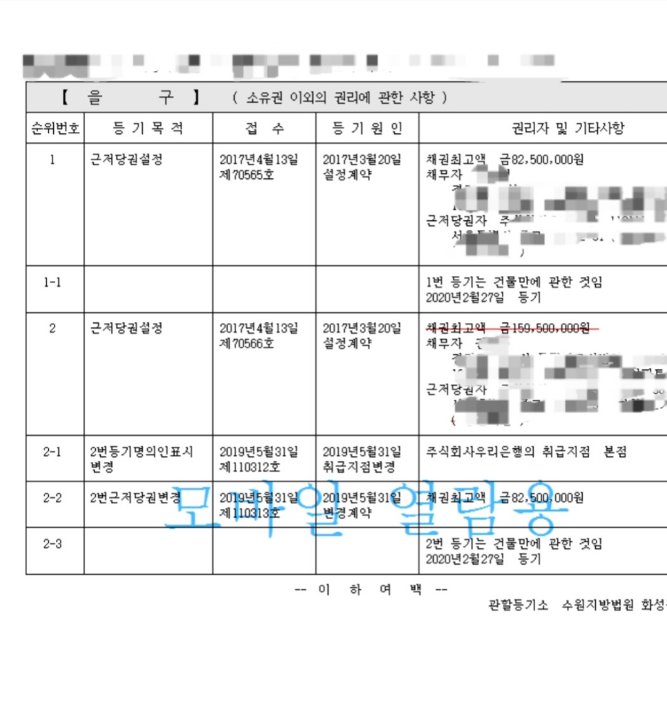 우선 근저당을 말씀드리면 , 현재 1번 82,500,000원과 2번 82,500,000원 이렇게 총 두개의 근저당이 남아있습니다. 채권최고액이기 때문에 실제 대출금액은 이보다 낮을 수 있고 총 근저당 금액은 1+2를 더한 1억 6500만원 입니다. 사실상 매매에 있어서 근저당은 위험요소가 아닙니다, 이유는 매매계약 후 잔금지급시 매도자가 본인명의의 근저당을 전부 변제하고 근저당 말소를 하기 때문입니다. 실제 매수받고 이전등기와 말소등기를 동시에 하면 이후 등기부에는 근저당 모두 소멸되어 빨간줄이 그어져 있을 것으로 보입니다. 매매계약서상 특약사항으로 잔금지급후 근저당을 말소한다는 조항을 확인하시고 매매하시면 될듯 보입니다.