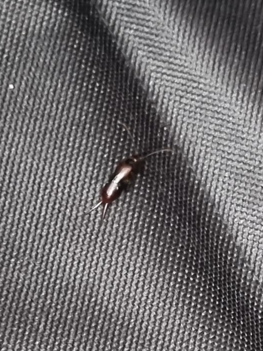 일단 빛때문에 잘 안보이긴 합니다만, 긴 더듬이에 짙은갈색의 몸통, 특히 배쪽의 미각2개부분을 봣을땐 바퀴벌레로 추정됩니다. 크기를 봐선 태어난지 얼마안되는 새끼인것같습니다.자주 발견된다면 주변에 바퀴벌레 알이 잇을확률이 높습니다.