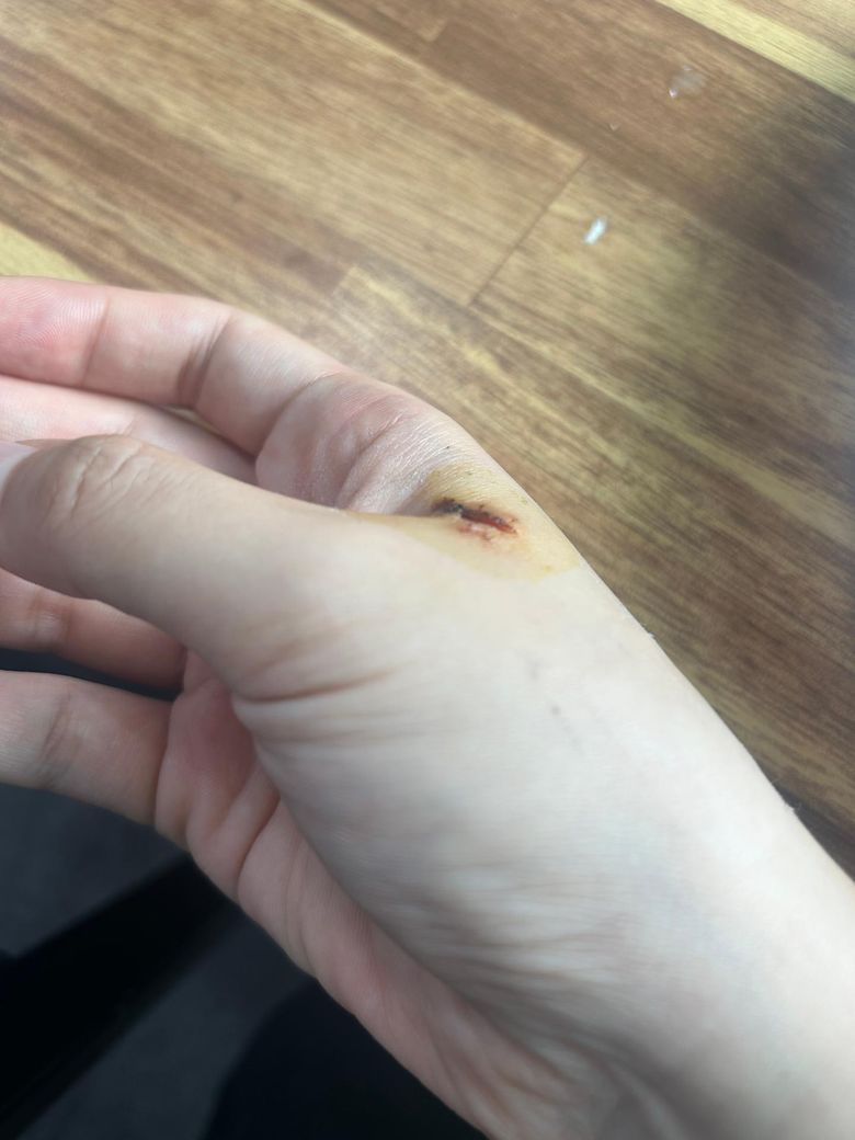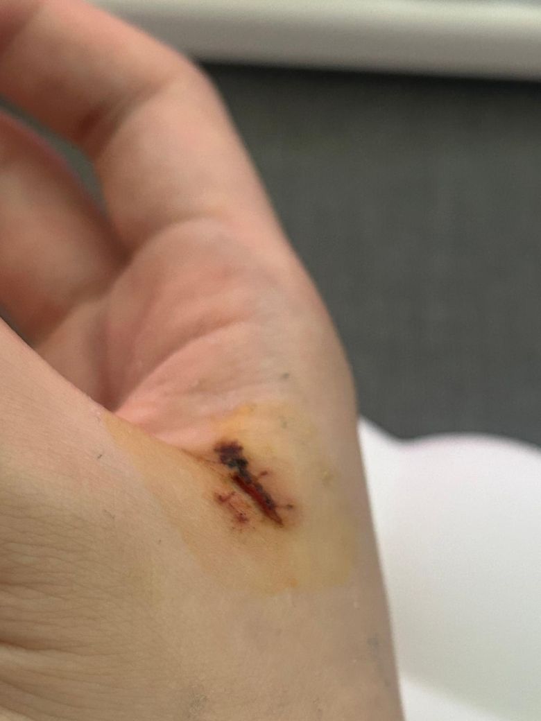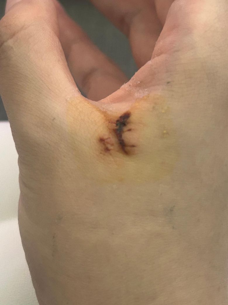 손을 다쳐 3세바늘 봉합 후 2주가 된 오늘 실밥을 제거 하였습니다.