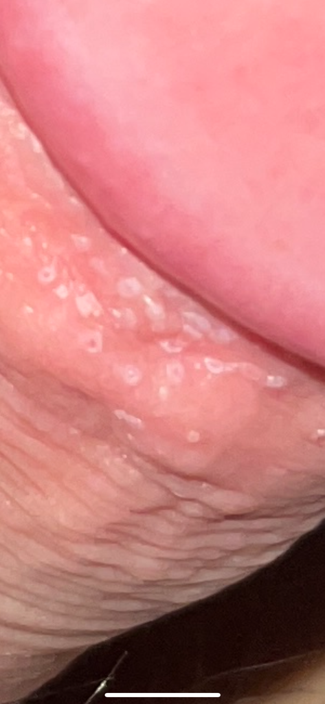 성기 안쪽 수포 생겨서 비뇨기과 내원 전에 궁금하여서 질문합니다. 벗겨진 수포도 있고 그래서 잘 안 보이는데 사진으로 촬영하면 저렇게 나타납미다.