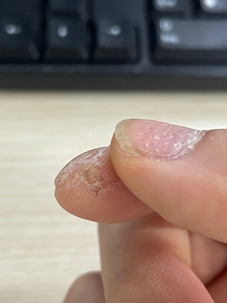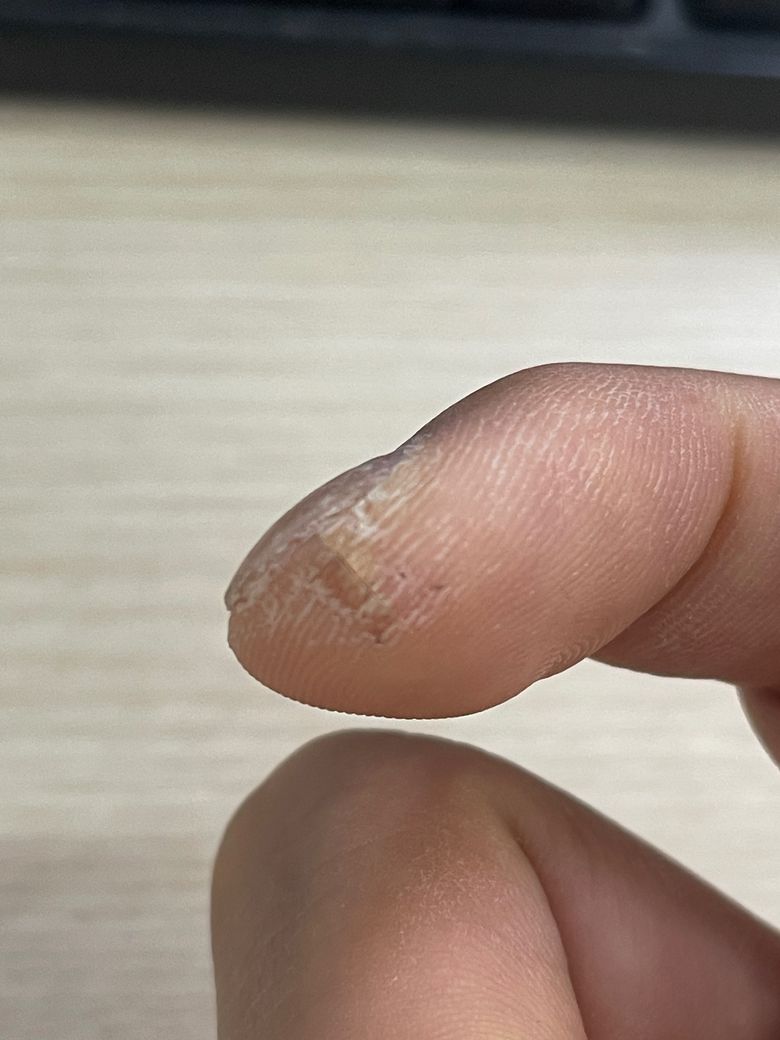 사진을 보면, 실밥을 푼 뒤 상처 가장자리는 이미 대부분 붙어 있고, 표면이 단단해졌다가 샤워 후 불려지면서 딱딱했던 각질·가피가 떨어져 나가며 속살이 살짝 보이는 상태로 보입니다. 이건 실밥 제거 후 3~5일 사이에 손가락에서 꽤 흔히 보이는 모습입니다. 특히 손가락은 움직임이 많고 물에 자주 닿아 이런 현상이 더 잘 생깁니다.