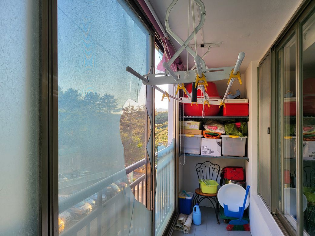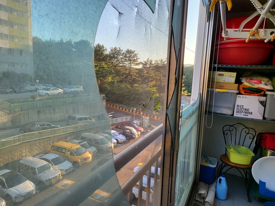 태풍으로인하여 베란다 창문 두장이 깨어지고 샸시가 전체적으로밀려 샷시 상단 부분이 굽어져 있었습니다(샷시 업자분은 조심스레 따로 저에게 임차인이 창문을 열어본거같다 라고 하셨습니다) 방문을 해보니 샷시 아랫부분에만 신문지 같은것을 한장 끼워 두었고 문틀이나 유리에 테이프를 붙히거나 젖은 신문을 바르는 행위는 없었고 추가 피해를 막기위한 어떠한 조치도 하지않아 아래에서 이러한 사실을 모르고 화단에서 경비아지씨께서 작업을 하고 계시는것을 보고 놀라 제가 위에 세대가 창문이 깨졌어니 위험하니 빨리 밖으로 나오시고 차량 주차를 막아달라고 하였어며 철거를 위해 사람이 오는 시간동안 추가 피해를 막고자 테이프로 금이간 유리부분과 창틀 부분을 붙혀 두었습니다