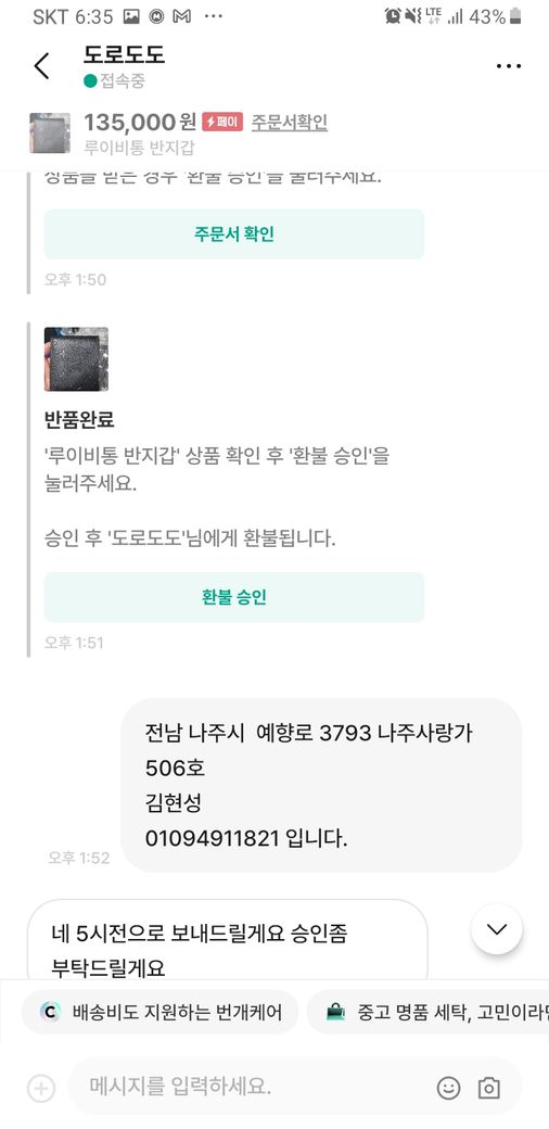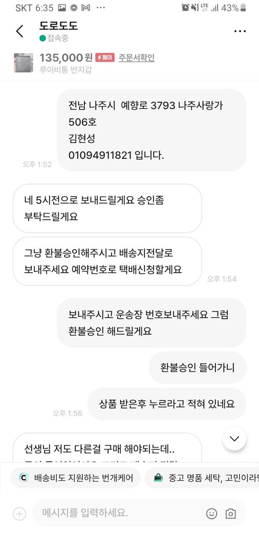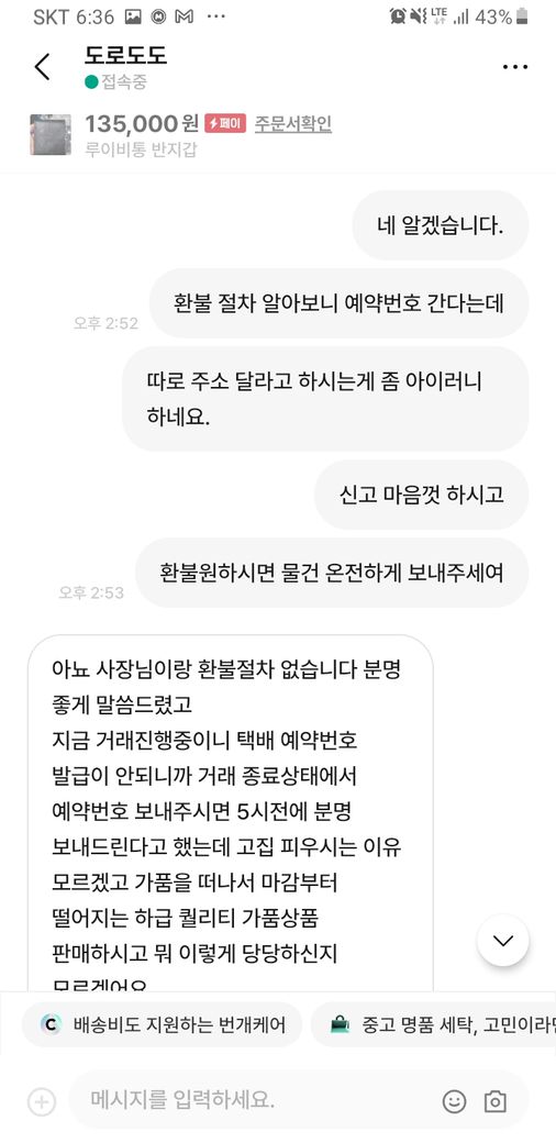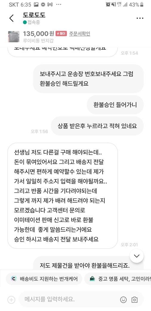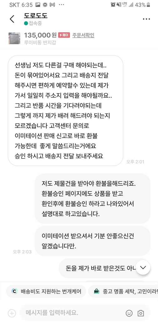 안전거래를 원하셔서 저는 흔퀘히 승락 하였고 오늘 물건을 받으시더니 가품같다면 환불 요청을 하였습니다.