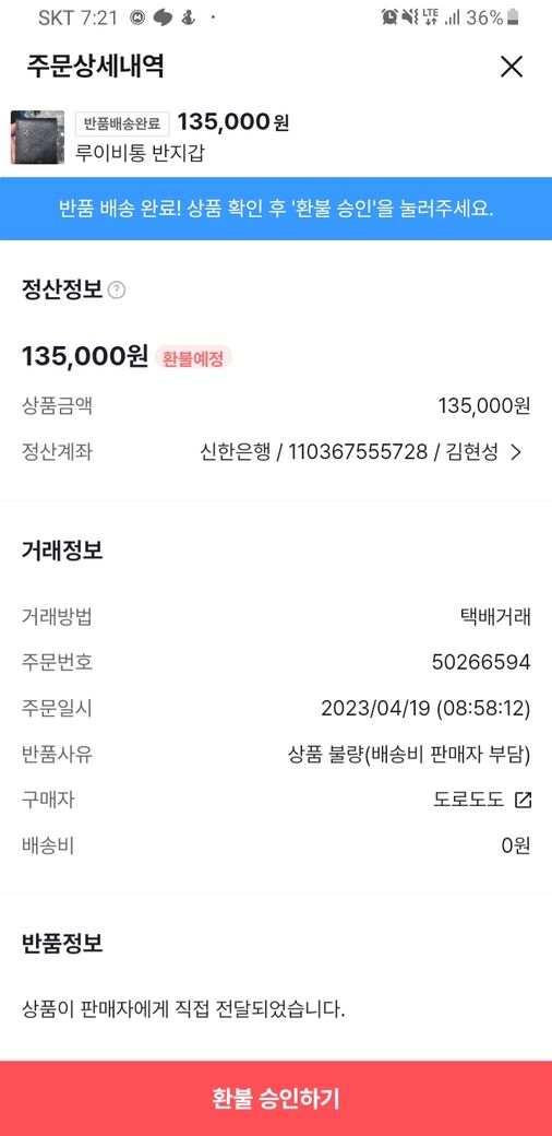 구매자분 께서 환불승인을 요청하셨는데 사진에서 보시다 싶히 물건을 확인후에 승인버튼을 누르라 나와있어 물건을 받고 나서 환불해드린다 했습니다.