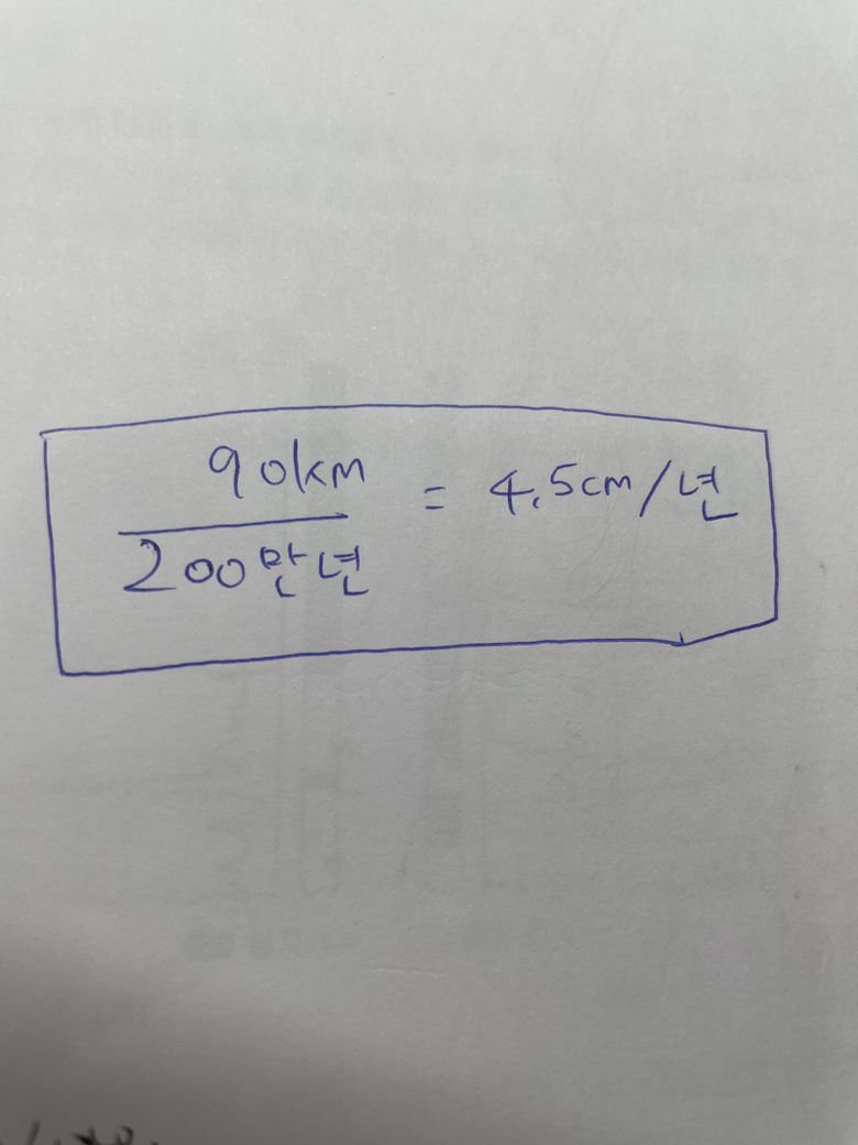 90km/200만년=4.5cm/년을 계산하면 1km = 1000m이고 1m = 100cm이니깐 90km → 90000m → 9000000cm 가 됩니다. 그리고 1만년 = 10000년이니깐 200만년 → 2000000년이 되고 그래서 9000000cm / 2000000년 = 4.5cm/년 입니다.