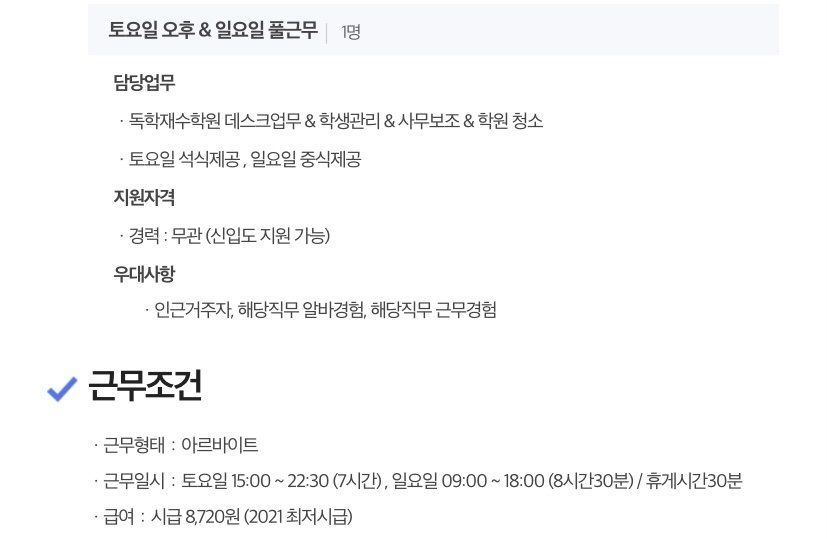 학원 아르바이트를 구인구직사이트를 통하여 알게 됐으며, 두 사이트의 공고 내역은 다음과 같습니다.