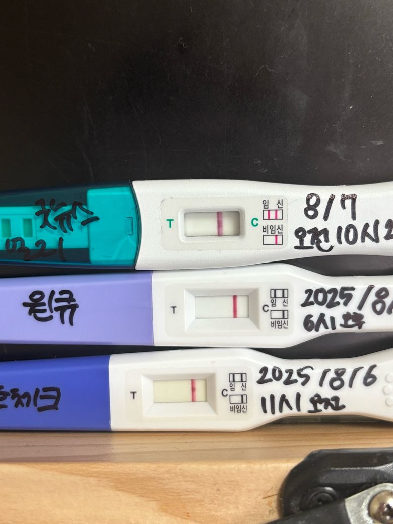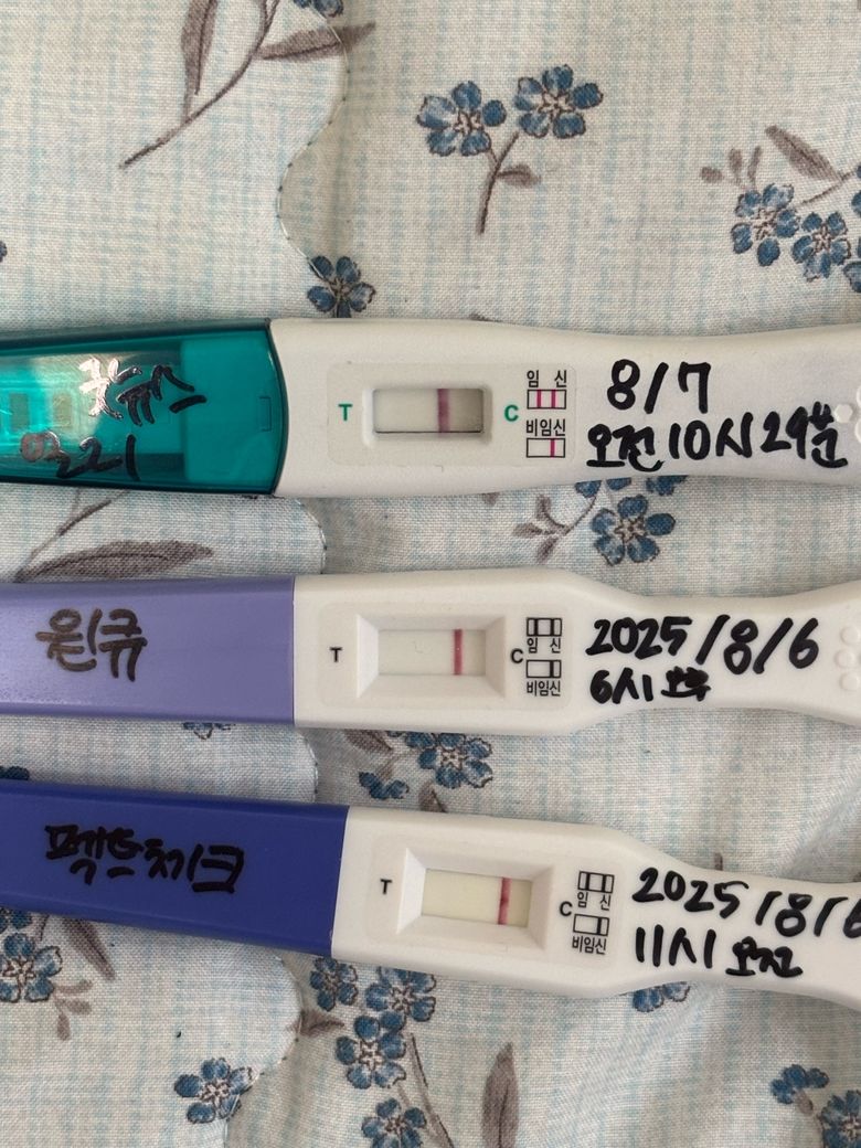 오늘 아침에 테스트기 한 번 더 해봤는데 한 줄인듯 두줄인듯 진짜 엄청 희미하고 흐릿하게 두줄이더라구요 3-5분 이내에는 확인을 못했지만 5분 지나서 보니까 저렇게 떴어요.. 증상은 생리인데 뭐죠..? 병원에서는 5일간격으로 테스트기를 또 하라그러고.. 본인들이 해줄 수 있는 게 없대요..