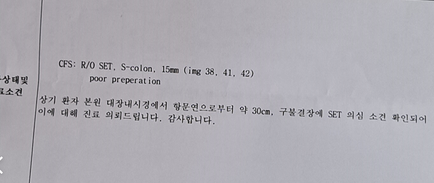 의사 소견서에 따르면, 대장내시경 검사에서 항문으로부터 약 30cm 지점에서 구불결장에 15mm 크기의 용종이 발견되었으며, 이 용종은 SET(서브에피리얼 튜머, subepithelial tumor)로 의심된다고 기록되어 있습니다. SET는 점막 아래에 위치한 종양을 의미하며, 일반적인 용종과는 다를 수 있어 상급병원에서 추가 평가와 치료가 필요합니다. 그러나 대부분은 악성이 아닌 양성 상태이기 때문에 크게 우려하시지는 않으셔도 될것으로 사료됩니다.