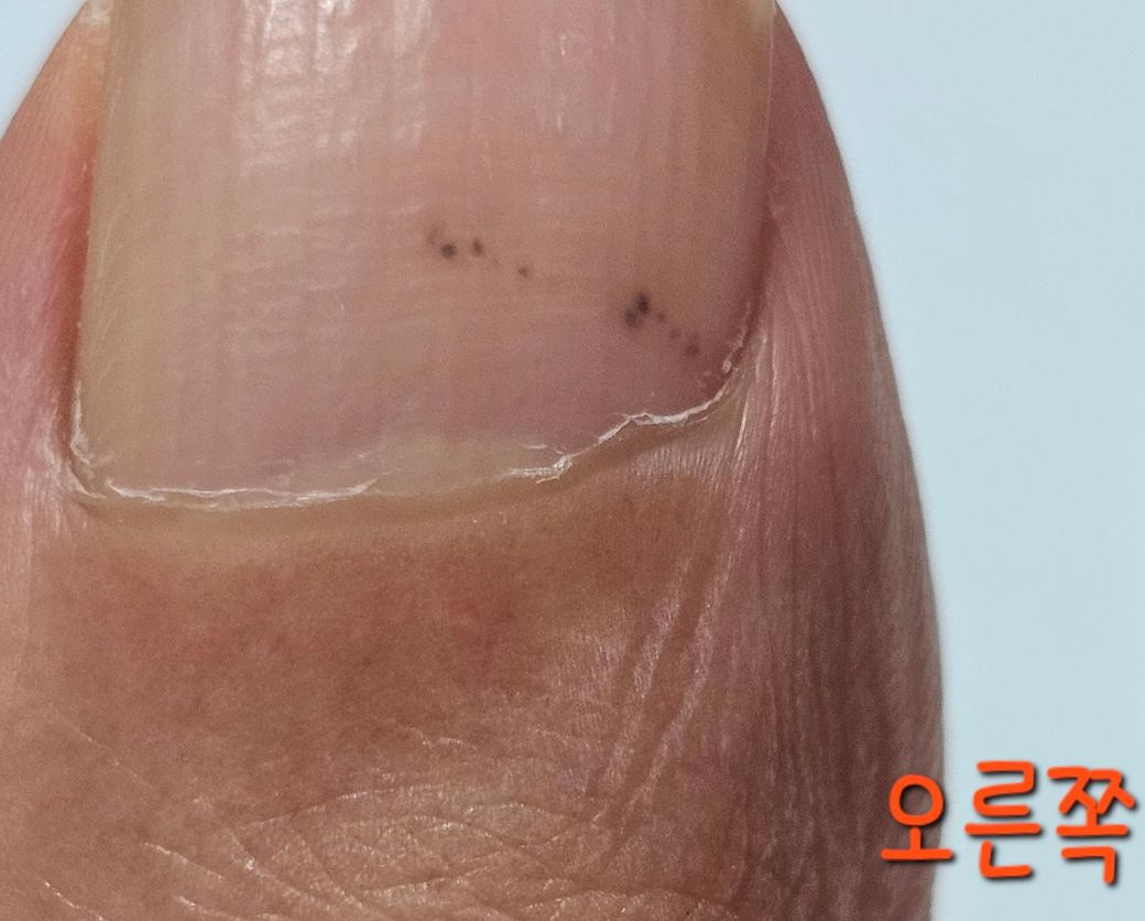 발톱에 생긴 작은 검은 점들은 여러 원인으로 생길 수 있으며, 흑색종(악성 피부암)과 관련이 있는 경우도 있어 주의가 필요합니다. 하지만 사진만으로는 정확한 진단이 어렵습니다. 일반적으로 흑색종은 점점 커지거나 퍼지는 선형의 검은 선, 모양이 불규칙하거나 색이 진하고, 주변 피부로 번지거나 통증, 출혈, 갈라짐 등이 동반되는 경우 의심해 볼 수 있습니다. 그러나 그렇지 않고 작고 일정한 점 형태라면 단순 멍(출혈), 약물 영향, 혹은 외상성 변화일 수 있어요