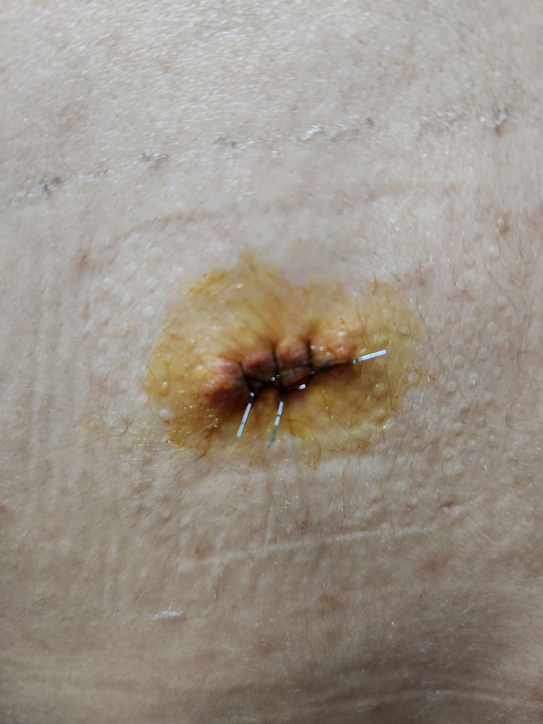 상처는 깨끗한 상태입니다. 땀에 젖으면 드레싱을 바로 갈아주셔야 하겠으며 지금처럼 소독하며 관리하시면 되겠습니다.