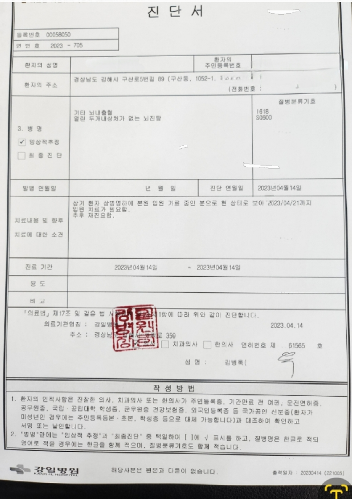 다만, 진단서상으로는 뇌출혈이 있다는 것만 있긴하나, 의무기록에는 님이 말씀하신 목욕탕에서 넘어진 사고등의 외상성 이야기가 있어 분쟁이 될 수 있으니,