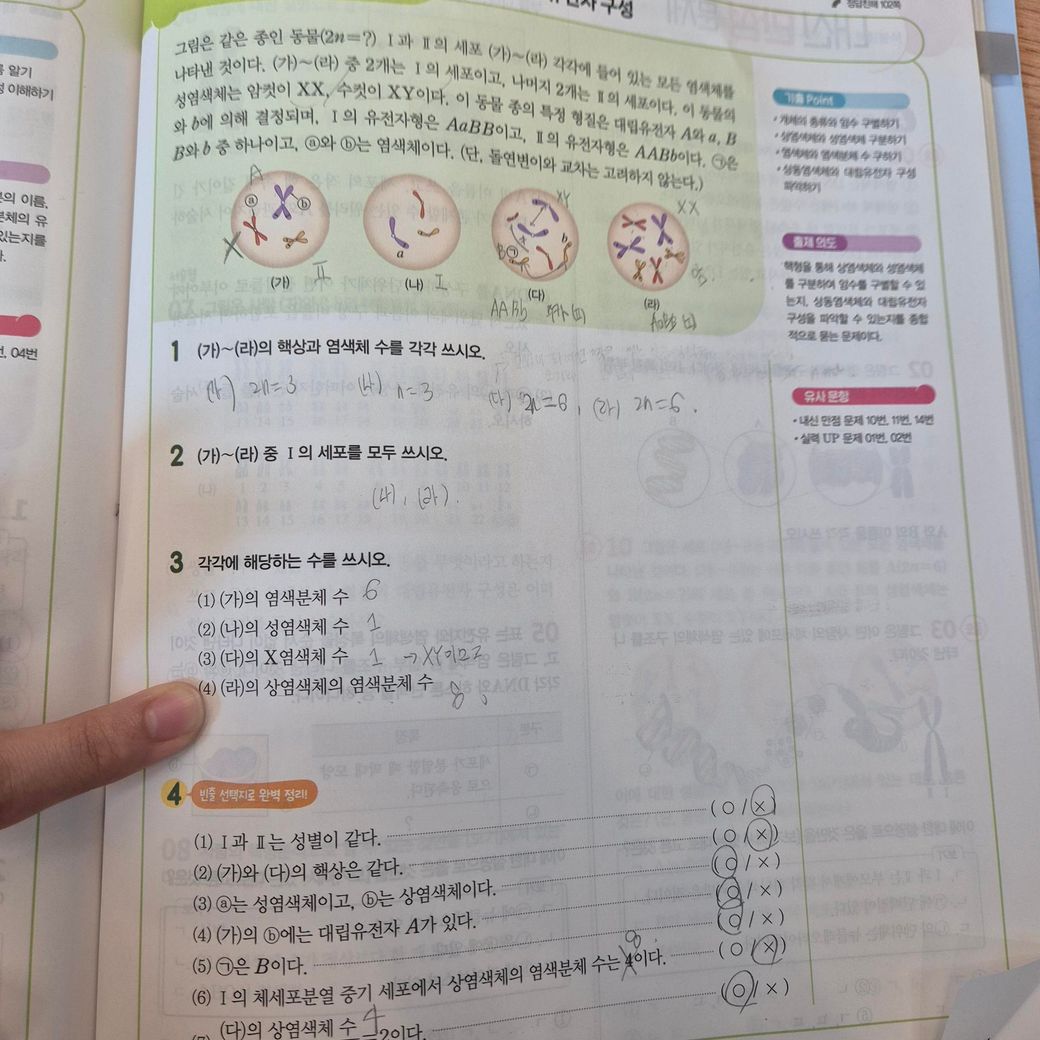 마지막으로 3번 문제를 보면 (1) (가)의 염색분체 수를 묻고 있는데요, (가)는 X자 염색체 3개입니다. X자 하나는 염색분체가 2개이므로 총 6개이므로 정답은 6입니다. (2) (나)의 성염색체 수는 반수체 생식세포이므로 성염색체는 X 또는 Y 하나만 가지기 때문에 1개입니다. (3) (다)의 X염색체 수는 XY 개체의 체세포라면 X 하나, Y 하나를 가지므로 X염색체는 1개입니다. (4) (라)의 상염색체 염색분체 수는 전체 염색체가 6개인데 그중 성염색체 2개를 제외하면 상염색체는 4개입니다. 이때 모두 복제된 상태이므로 각 염색체마다 염색분체 2개씩 가지기 때문에 4×2=8개입니다. 감사합니다.