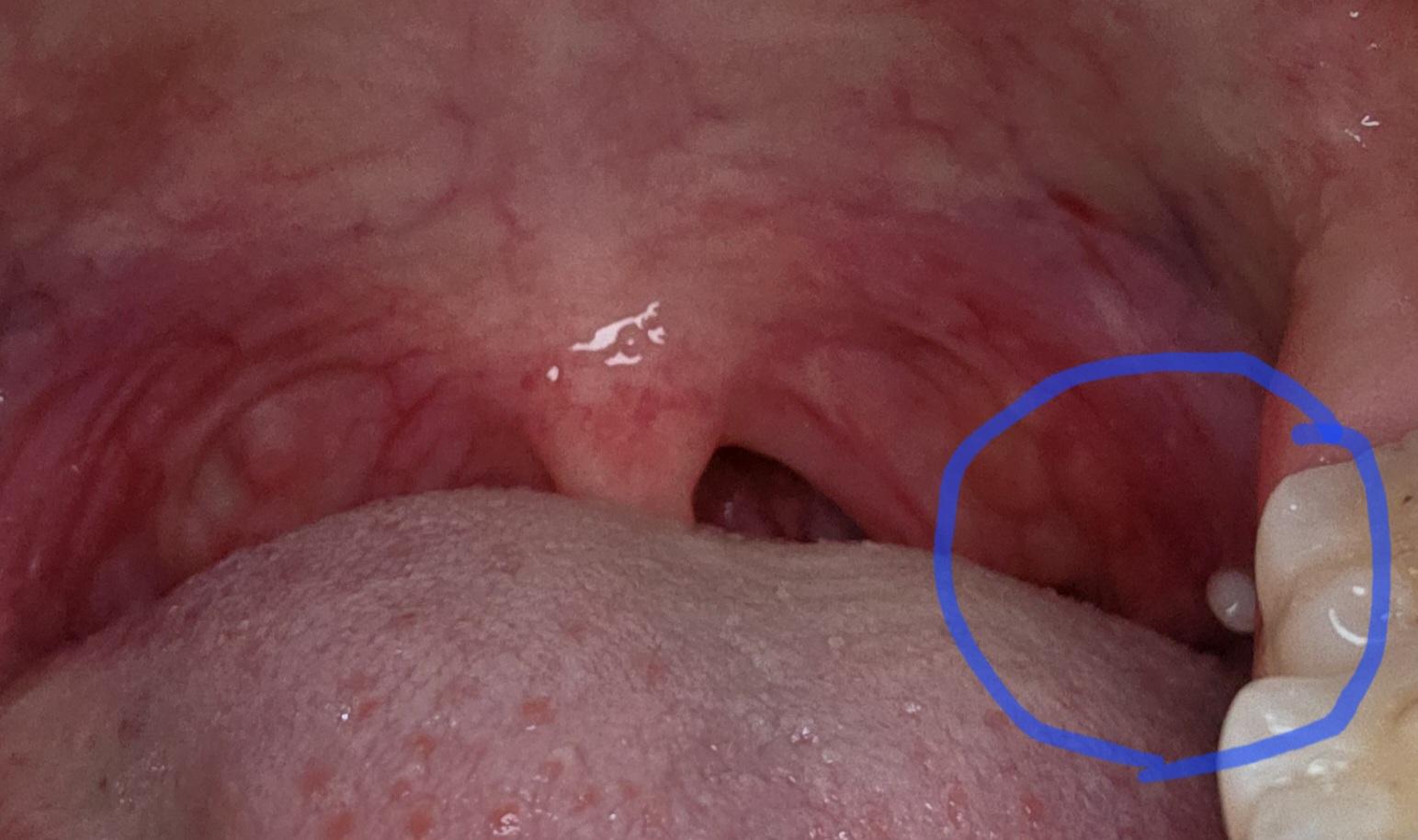 동그라미 친 부분 편도결석이 맞나요?