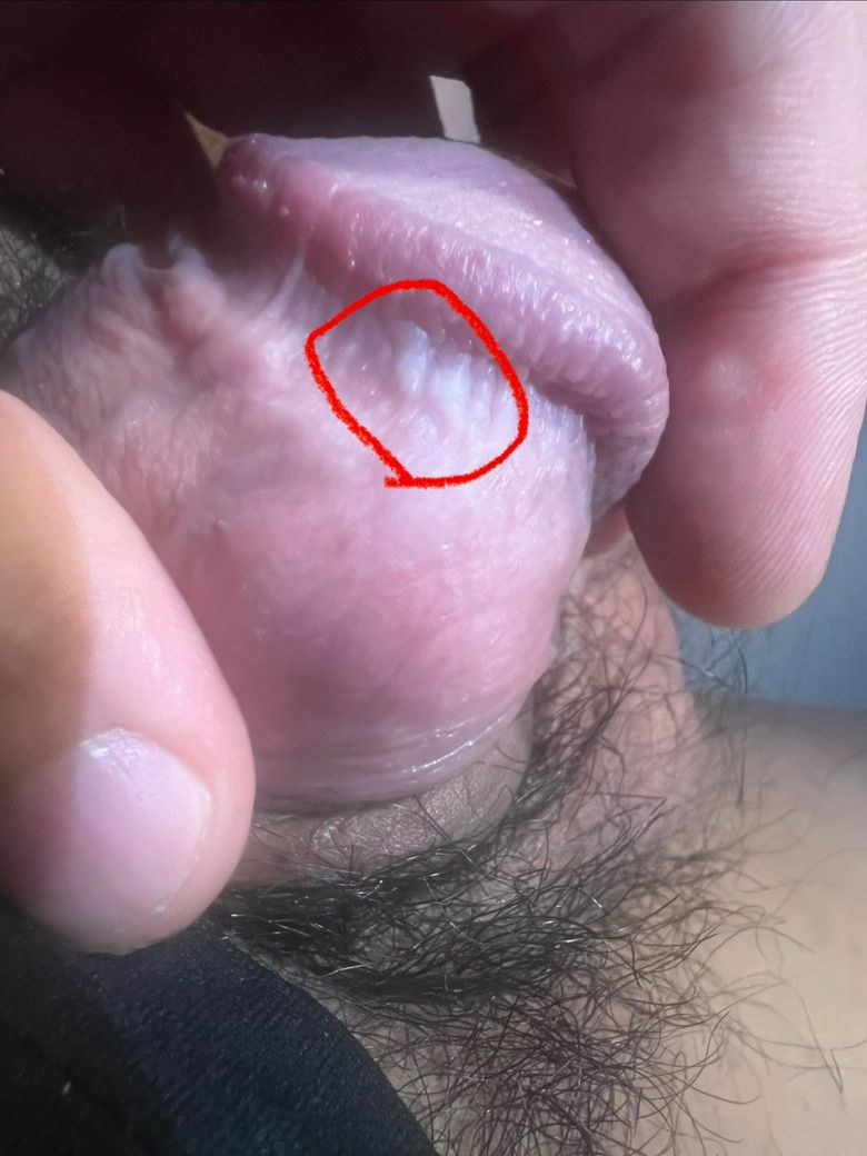 사진 기준으로 보면, 표시하신 부위는 “돌출된 사마귀 형태”라기보다는 매끈한 표면 위에 미세한 흰색 점들이 모여 있는 형태입니다. 크기도 작고, 표면이 울퉁불퉁하게 자라나는 모습은 아닙니다.