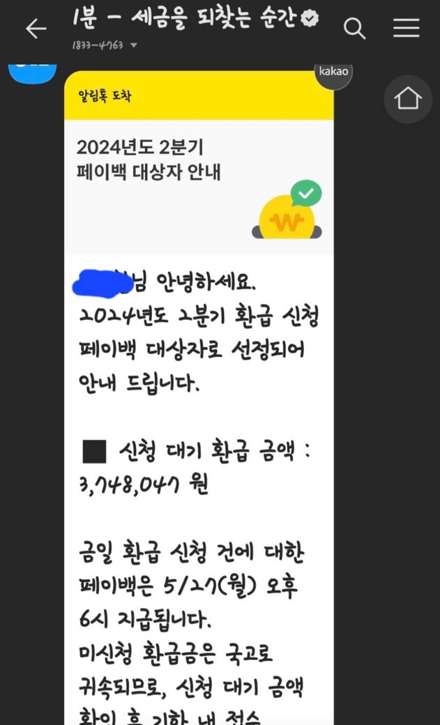 환급 대상 금액을 저렇게 톡으로 알려주는 서비스는 없습니다.