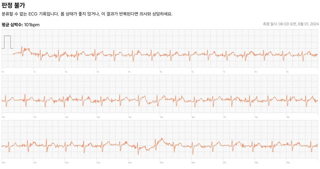 워치의 ECG 기록에서 보이는 심전도는 노이즈가 심하여 정확히 판별하기가 어렵습니다.