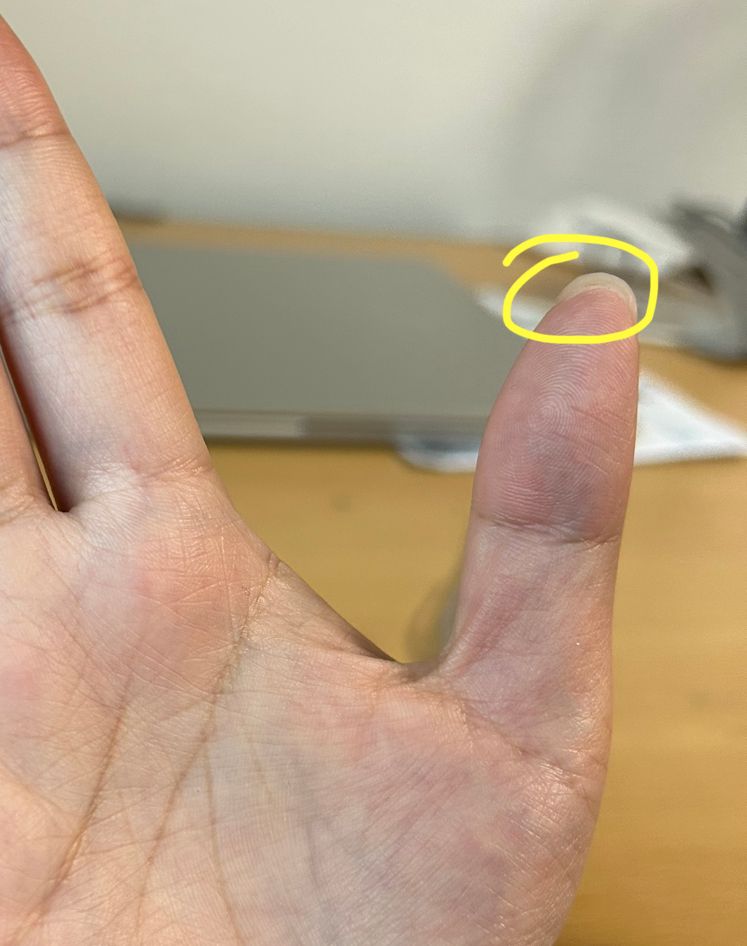 어제까지 멀쩡했는데 오늘 아침에 일어나보니 엄지손가락이 아파 살펴봤습니다. 사진 상으론 좀 괜찮아보이는데, 아침 당시에는 샤워하고 나온 것마냥 피부가 쪼그라들었습니다. 그리고 엄지손가락을 누르면 물집잡힌것마냥 막같은 느낌이 느껴졌고, 사진 속 노란 동그라미 범위는 살짝 누르기만 해도 너무 아팠습니다.(지금도 아파요..) 지금은 엄지손가락 움직일때마다 찌릿하고 전기가 흐르는 듯한 느낌이 들어요. 왜 그런 거고 제가 어떻게 해야할지 알려주실 수 있을까요?